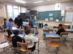 国語の時間に学習した「かさこじぞう」のお話。今回は、図工の学習で、おじいさんが雪の中、お地蔵さんにかさをかぶせていく様子を絵に表しました。子ども達は、お話で学習した時の情景を思い浮かべながら集中して描いていました。