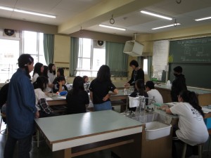 理科室で6年生は理科の実験中でした。集気びんにロウソクの火を入れるとどのくらいで火が消えるのか?消えた後の集気びんの中にもう一度ロウソクの火を入れるとどうなるのか?実験で確かめました。実際にやってみるとよくわかりますね。